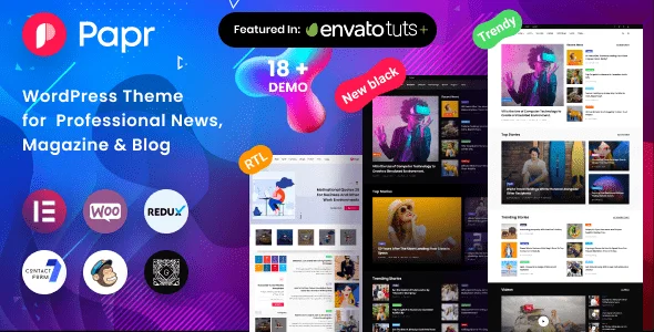 Papr được thiết kế cho báo điện tử, tạp chí, blog với Elementor kéo-thả, nhập demo 1-click, Ads Management, WooCommerce-ready, tuỳ chọn theme (Redux), Gutenberg support, RTL, và bố cục responsive. Trang demo tác giả liệt kê rõ Elementor, One-Click Installation, WooCommerce, Redux, Ads, Customizer, RTL, Responsive/Mobile optimized.
